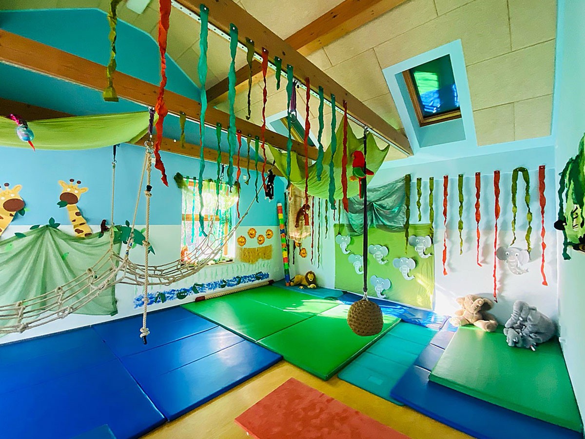 Ein Dschungel in der Kita: Von Liane zu Liane klettern, toben, träumen – mit selbstgestalteter Deko und Stofftieren wird der Bewegungsraum zum Abenteuer. Wir fördern solche Spielräume, damit Kinder weiterhin fantasievoll entdecken können.